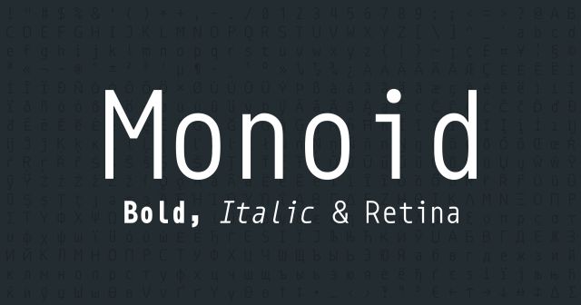 Monoid is a customizable, minimal + legible font optimized for coding. It’s customisable with ligatures, alternates and class based positioning.